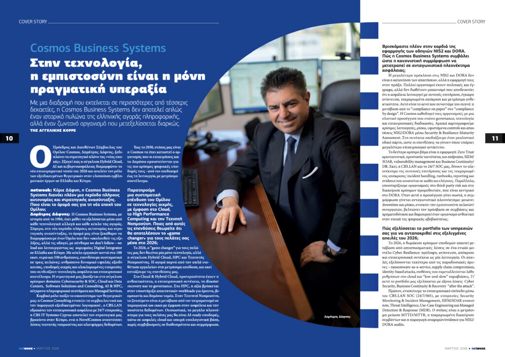 Βρισκόμαστε πλέον στην καρδιά της εφαρμογής των οδηγιών NIS2 και DORA. Πώς η Cosmos Business Systems συμβάλει ώστε η κανονιστική συμμόρφωση να μετατραπεί σε ανταγωνιστικό πλεονέκτημα ασφάλειας;