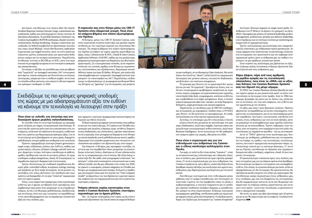 Η προσωπική μου υπόσχεση προς τους πελάτες και τους συνεργάτες μας για τα επόμενα χρόνια είναι ξεκάθαρη: θα συνεχίσουμε να είμαστε ο συνεργάτης που αναλαμβάνει ευθύνη. Όχι απλώς να εγκαταστήσουμε μια λύση, αλλά να εξασφαλίσουμε ότι θα λειτουργεί, θα προστατεύεται, θα εξελίσσεται και θα υπηρετεί τον στόχο του οργανισμού. Θα επενδύσουμε ακόμη περισσότερο στους ανθρώπους μας, στις υποδομές μας και στη διαφάνεια της συνεργασίας. Και θα παραμείνουμε πιστοί σε αυτό που θεωρούμε πιο σημαντικό: να χτίζουμε σχέσεις εμπιστοσύνης που αντέχουν στον χρόνο — γιατί στην τεχνολογία, η εμπιστοσύνη είναι η πραγματική υπεραξία.