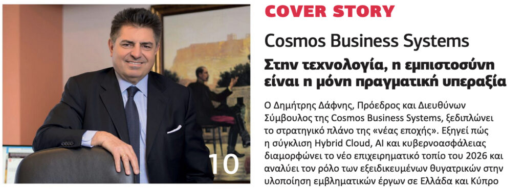 Ο Πρόεδρος και Διευθύνων Σύμβουλος του Ομίλου Cosmos, Δημήτρης Δάφνης, ξεδιπλώνει το στρατηγικό πλάνο της «νέας εποχής». Εξηγεί πώς η σύγκλιση Hybrid Cloud, AI και κυβερνοασφάλειας διαμορφώνει το νέο επιχειρηματικό τοπίο του 2026 και αναλύει τον ρόλο των εξειδικευμένων θυγατρικών στην υλοποίηση εμβληματικών έργων σε Ελλάδα και Κύπρο.