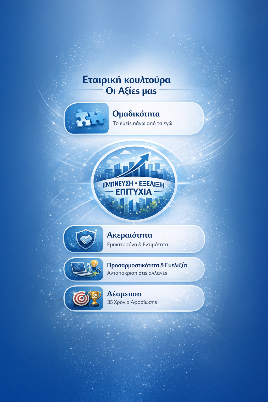 Η δική μας εταιρική κουλτούρα είναι δομημένη στη συμμετοχή και την ελευθερία των εργαζομένων μας να λαμβάνουν ρίσκα, να προτείνουν ιδέες και να δοκιμάζουν στην πράξη τις δυνατότητές τους. Ένα εργασιακό περιβάλλον που σε εμπνέει και ταυτόχρονα σε ωθεί να προχωράς μπροστά, να θέτεις τους δικούς σου στόχους και να συνεισφέρεις με τη δική σου σφραγίδα στο εταιρικό αποτέλεσμα. Επενδύουμε στη μάθηση μέσω συνεχών εκπαιδεύσεων και πιστοποιήσεων και με αυτόν τον τρόπο καλλιεργούμε ένα περιβάλλον όπου όλοι μαζί μπορούμε να αποδώσουμε στο μέγιστο των δυνατοτήτων μας. Το κλειδί για την επιτυχία μας είναι οι ικανοποιημένοι εργαζόμενοι και φροντίζουμε καθημερινά για να το πετύχουμε αυτό.